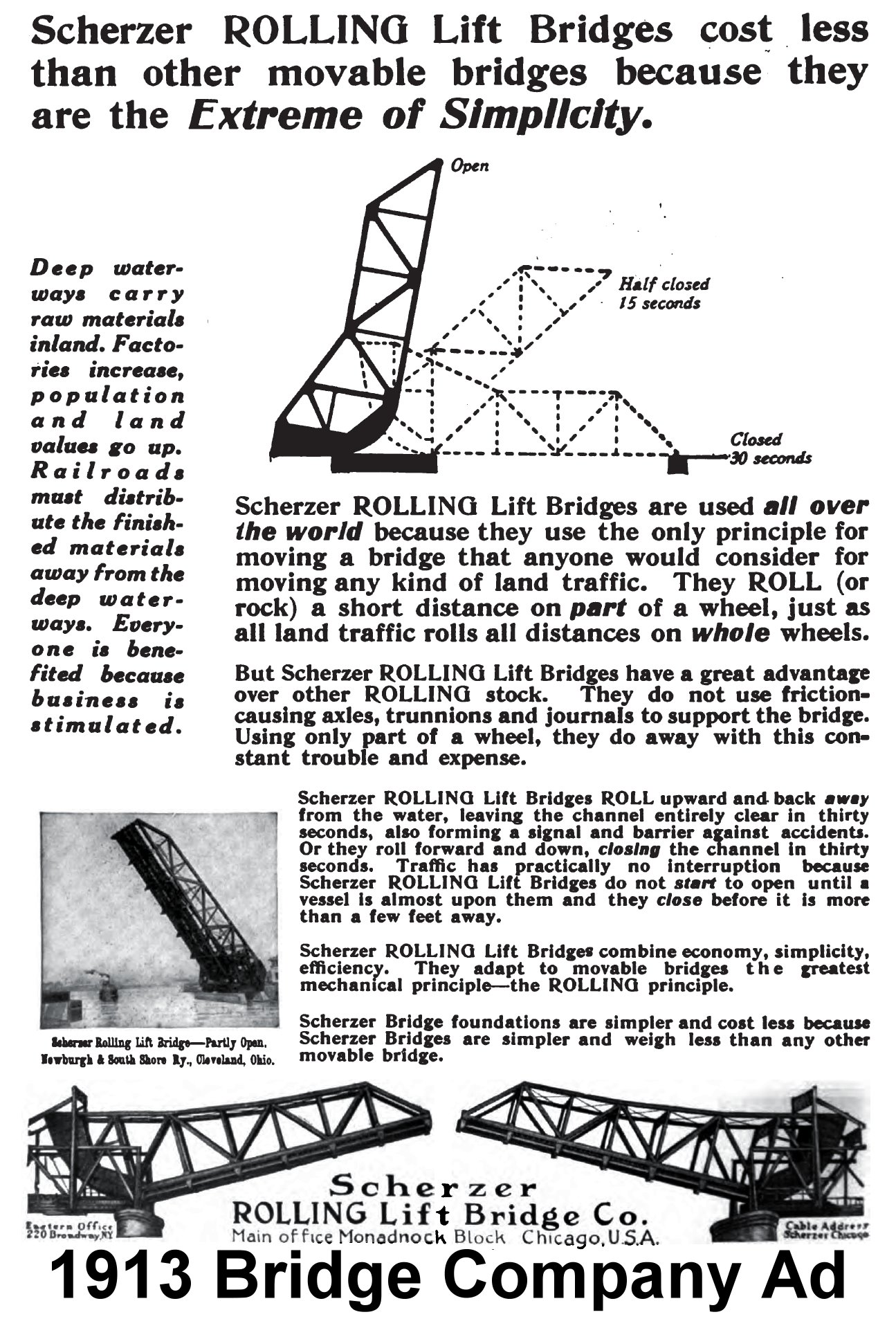 You have to love something that's called a "Scherzer rolling bascule lift bridge" even if you don't know what on Earth it means. And it is a magnificent beast. "Scherzer" refers to William Scherzer who pioneered a particular design of bascule bridges in the US. The term "bascule" refers to bridges that open and close with a system of counterweights that balance the bridge continuously as the bridge rises and falls. The whole bridge used to swing upwards on its rocker. There's a lovely advert from 1913 on the Historic Bridges site showing how it operated: http://www.historicbridges.org/illinois/mcdonough/ad_large.jpg. Tower Bridge is a bascule bridge, but not of the Scherzer variety.